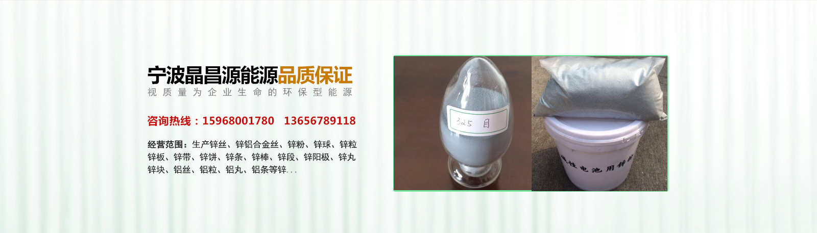 寧波晶昌源能源有限公司位于寧波市北侖區,公司視質量為企業的生命,嚴格執行行業標準和國際標準,鋅制品采用葫蘆島鋅業股份有限公司生產的0#蒸餾鋅錠,鋁制品采用AL00鋁錠作為原材料,生產鋅絲、鋅鋁合金絲、鋅粉、鋅球、鋅粒、鋅板、鋅帶、鋅餅、鋅條、鋅棒、鋅段、鋅陽極、鋅丸、鋅塊、鋁絲、鋁粒、鋁丸、鋁條等鋅、鋁制品及鋅基合金、鋅鋁異形材。其中主導產品鋅絲11000噸/年,鋅鋁合金絲3200噸/年,鋁絲5300噸/年,鋅球6000噸/年,鋅粒5500噸/年,鋅粉10000噸/年以上...
